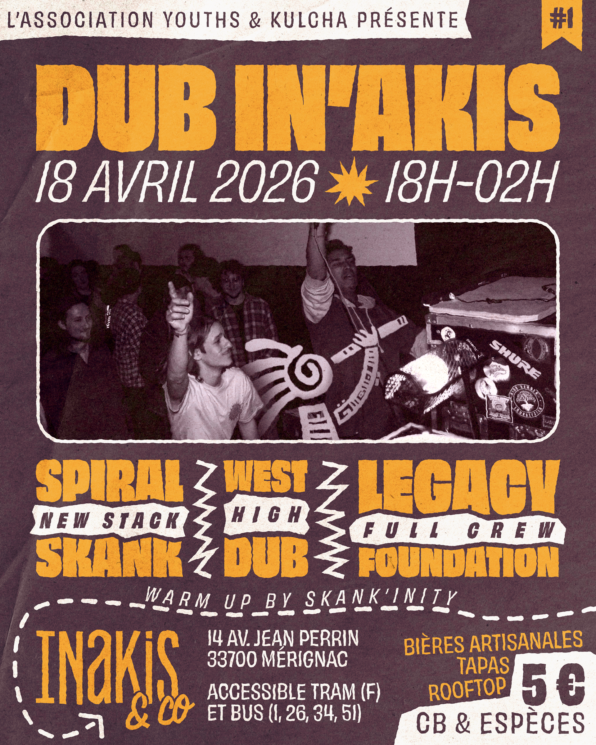 Pour l'inauguration de la nouvelle configuration du "Spiral Skank Sound System", l'association "Youths & Kulcha" a invité "Legacy Foundation". Ce collectif et sound system basé à Belle-Île-en-Mer, en Bretagne, jouera pour la première fois à Bordeaux ! Je me suis occupé de faire l'affiche de A à Z, avec comme base, les couleurs et illustrations de Zoé. Les logiciels utilisés ont été Figma et Photoshop.